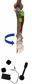 Das Patientenscreening beinhaltet zudem die Untersuchung der Gelenkfunktion der unteren Extremität. Bei selbstständiger Geh- und Stehfähigkeit wird das unversorgte Gehen und Stehen analysiert. Dabei muss sichergestellt werden, dass die Fußhebung für das spätere Probegehen in der Schwungphase möglich ist, damit ein Fersenaufsatz während der Lastantwort ermöglicht und das Sturzrisiko somit so klein wie möglich gehalten wird. Ferner wird im Sitzen die Elektrodenplatzierung getestet. Dabei wird die Nervenelektrode über dem N. peroneus communis, also im distalen, leicht dorsal versetzten Bereich des Fibulaköpfchens platziert. Die Muskelelektrode wird direkt auf dem M. tibialis anterior platziert, also im anterior-distalen Bereich der Nervenelektrode. Mit der Elektrodenverschiebung am N. peroneus communis nach ventral wird die Fußhebung mehr von einer Adduktion begleitet, mit einer Verschiebung weiter nach dorsal mehr von einer Abduktion (Abb. 3). Das Ziel sollte eine Fußhebung mit 15° Dorsalextension im oberen Sprunggelenk mit ca. 10° Fußaußenrotation sein. Abschließend folgen die ersten Gehversuche und weitere dynamische Optimierungsschritte, sodass diese Werte vor allem während der frühen Schwungphase erreicht werden. So wird z. B. die Stromstärke des Stimulus (mA) angepasst, wobei die Einstellparameter so lange optimiert werden, bis ein weitestgehend physiologisches Gangbild erreicht wird.