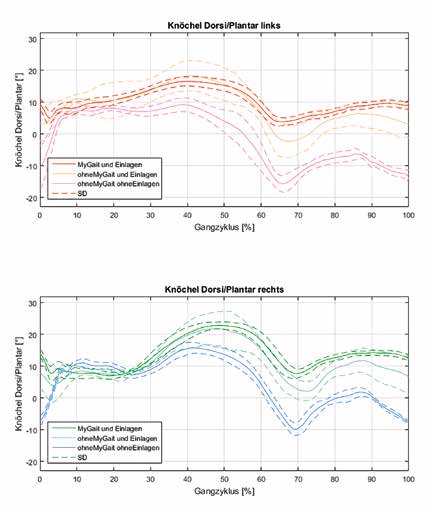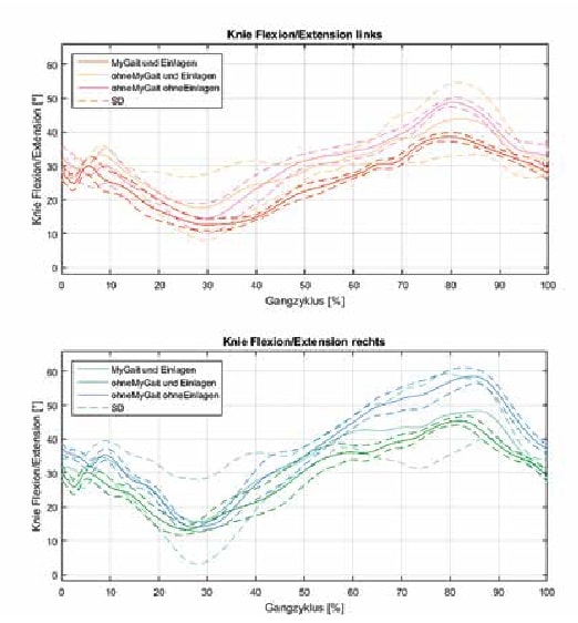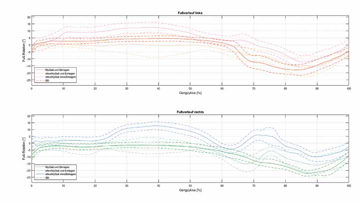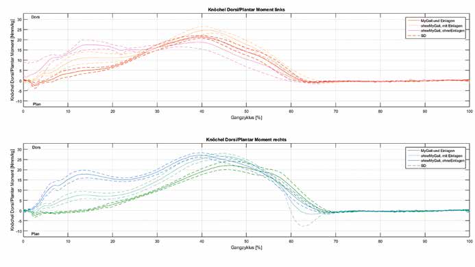 Im Zusammenspiel mit der FES wird die ohnehin schon vermehrte Vorfußabduktion nochmals erhöht. Gleichzeitig wird die Fußhebung durch die FES weiter verstärkt 8 9 10, was insbesondere während des initialen Bodenkontakts, aber auch während der Schwungphase ohne eigentliche Wirkung der SME deutlich wird. Im Ergebnis wurde eine schwungphasenabhängige Fußhebung ermöglicht, die gleichzeitig eine kniestreckende Wirkung erzielt. Die durch konsekutive Versorgung bedingte stufenweise Reduzierung der Drehmomente im oberen Sprunggelenk zeigt auf, dass allein mit einer effektiven Einlagenversorgung eine signifikante Energieersparnis zu erreichen ist. Diese kann durch eine Kombinationsversorgung mit FES noch einmal deutlich gesteigert werden. Beide Versorgungen wirken dabei am Fuß gegenläufig rotatorisch. Aus der Sagittalebene betrachtet wird die Lastübernahme in der Standphase mit Näherung zur physiologischen Knie- und Hüftstreckung augenscheinlich mit verbesserter Rumpfstabilität und weniger kompensatorischen Bewegungen im Oberkörper ermöglicht. Die Stimulationssignalintensität erhielt am Ende der Untersuchung noch einen variablen Wertebereich, sodass der Patientin eine situationsbezogene Anpassung im Alltag erhalten blieb.