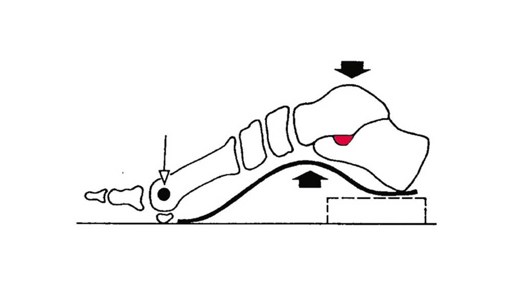 Wenn das Grundproblem eines Knickfußes die Valgusstellung der Ferse ist, so muss eine Einlagenversorgung auch am Fersenbein ansetzen und versuchen, dieses aufzurichten. Hier kommt das vielfach beschriebene Sustentaculum tali ins Spiel, an dem nach verbreiteter Lehrmeinung der höchste Punkt der medialen Längswölbungsstütze verortet werden soll. Schon die Bezeichnung „Längswölbungsstütze“ deutet aber an, dass dieses Element gar nicht die Aufgabe hat, das Fersenbein aufzurichten, sondern die Längswölbung zu unterstützen. In der entsprechenden Abbildung bei Hohmann/Uhlig 7 befindet sich dementsprechend ein dicker Pfeil als Symbol für die Krafteinleitung unter dem höchsten Punkt der Einlage am Taluskopf – dort, wo sich auch anatomisch der höchste Punkt der Längswölbung befindet, nicht am weiter hinten liegenden Sustentaculum tali (Abb. 3). Trotzdem ist im Begleittext zur Abbildung zu lesen, „die Unterstützung erfolgt unter dem Sustentaculum tali“.
