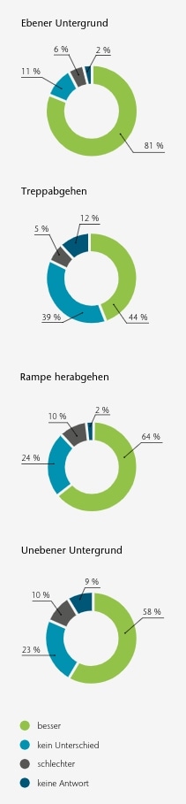 Trotz dieser beeinflussenden Faktoren geben die Ergebnisse einen Hinweis darauf, dass eine Verbesserung des Laufens in verschiedenen Situationen wie zum Beispiel auf Schrägen, unebenem Untergrund und auf Treppen das Sicherheitsempfinden des Anwenders positiv beeinflusst.