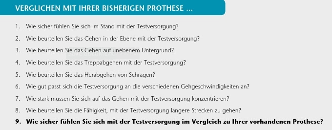 In einem weiteren Schritt wurde die Beziehung zwischen dem Ergebnis der Frage 9 („Wie sicher fühlen Sie sich mit der Testversorgung?“) und den Ergebnissen der Fragen 1 bis 8 (s. Abb. 1) untersucht, die sich auf die unterschiedlichen Situationen des Gehens beziehen. Es konnte festgestellt werden, dass eine Beziehung zwischen den Ergebnissen dieser Fragen besteht: Das Sicherheitsempfinden wird positiv beeinflusst, wenn eine Verbesserung beim Treppabgehen, beim Gehen in unterschiedlichen Geschwindigkeiten und auf verschiedenen Untergründen erreicht werden kann.