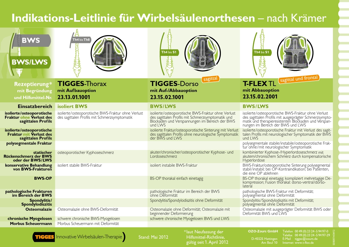 Hierbei kann auf Grundlage der Indikationsleitline für Wirbelsäulenorthesen nach Krämer unterschieden werden (Abb. 1), ob bei leichteren Beschwerden eine Aufrichtung nur in der Sagittalebene ausreicht (Tigges-Dorso) oder ob bei schwereren Fällen eine Entlastung und Aufrichtung in Sagittal- und Frontalebene erforderlich ist (T‑Flex TL).