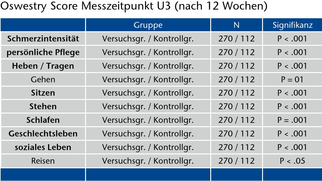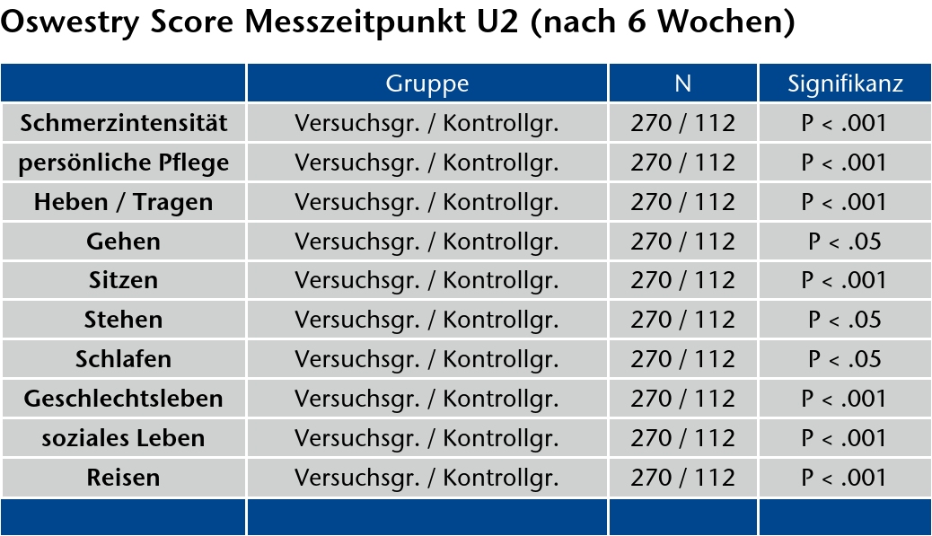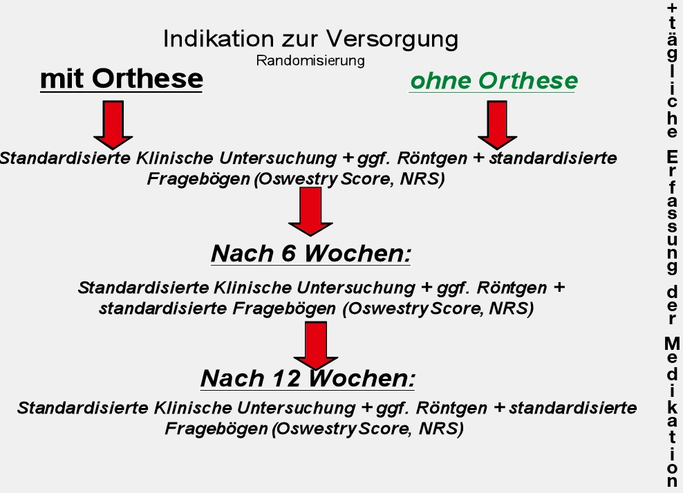 Sowohl zu Studienbeginn als auch zur Nachuntersuchung nach 6 Wochen und nach 12 Wochen war eine fachärztliche, standardisierte körperliche Untersuchung vorgesehen, bei entsprechender Indikation einschließlich einer Röntgenkontrolle. Parallel zu den eingesetzten standardisierten Untersuchungsbögen und Fragebögen (Oswestry Score, NRS u. a.) wurden multiple weitere Parameter erfasst, unter anderem die Parameter Schmerzreduktion, Tragehäufigkeit und subjektive Wirksamkeit der Orthese, Compliance und Analgetikaverbrauch sowie AU-Tage. Es wurde während des gesamten Untersuchungszeitraums täglich ein Medikamententagebuch geführt. Die Ergebnisse wurden ab einem Wert von p ≤ 0.5 als signifikant angenommen.