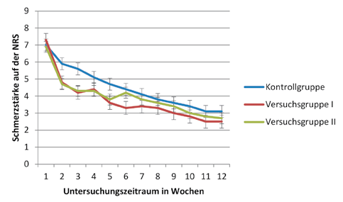 Zum Ende des Beobachtungszeitraumes nach 12 Wochen unterschieden sich die beiden Versuchsgruppen in der Schmerzintensität nicht mehr signifikant voneinander. Zum Messzeitpunkt NRS1 (T0) ist die quantitative Schmerzstärke in der Versuchsgruppe auf einem Niveau von p < 0.001. Ab NRS 3 (nach 3 Wochen) unterscheiden sich die Gruppen zu allen Messzeitpunkten erheblich voneinander. Die Patienten in den Versuchsgruppen geben signifikant weniger Schmerzen an als in der Kontrollgruppe. Dieser Unterschied ist für alle Messzeitpunkte konstant auf einem Niveau von p < 0.001 deutlich. Die Überprüfung der Mittelwertunterschiede erfolgte mittels T‑Test für unabhängige Stichproben.