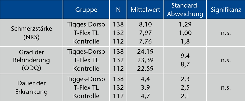Um statistisch signifikante Aussagen treffen zu können, war eine Mindest-Gruppengröße von jeweils 40 Probanden erforderlich. Diese wurde mit den vorhandenen Fallzahlen deutlich übertroffen: Versuchsgruppe I (mit Orthese und Abschulung) umfasste n = 138 Probanden, davon n = 68 in der Tigges-Dorso-Versorgung und n = 70 in der T‑Flex TL-Orthesenuntergruppe. Die Versuchsgruppe II mit Orthese und ohne Abschulung umfasste n = 132 Probanden, davon kamen n = 64 mit der Tigges-Dorso und n = 68 mit der T‑Flex TL-Orthese in die valide Auswertung. In der Kontrollgruppe ohne Orthese kamen n = 112 Probanden zur endgültigen und vollständigen Auswertung. N = 18 Probanden brachen die Studie ab, teilweise wegen Umzugs, teilweise, weil die Fragebögen bzw. Medikamententagebücher nicht vollständig ausgefüllt wurden. Es erfolgte kein Studienabbruch aufgrund unerwünschter Nebenwirkungen durch die Orthesenversorgung.