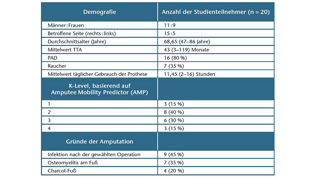 Zwanzig Teilnehmer (11 Männer, 9 Frauen) mit einem Durchschnittsalter von 68,65 Jahren (Spannbreite 47–86 Jahre) nahmen an der Studie teil. Die demografischen Daten der Teilnehmer werden in Tabelle 2 gezeigt. Die mittlere Zeit von der Amputation bis zu den TcPO2-Messungen betrug 43 (Spannbreite 3–119) Monate. Bei neun Teilnehmern waren Wundkomplikationen nach früheren chirurgischen Fußoperationen der Grund für die Amputation: vier Arthrodesen und fünf kleinere Fußamputationen. Weitere Gründe für eine Amputation waren Osteomyelitis aufgrund von Druckgeschwüren bei sieben Teilnehmern und Komplikationen der Charcot-Arthropathie (infizierte Druckgeschwüre mit nachfolgender Osteomyelitis) bei vier Teilnehmern. Vier Teilnehmer mussten zudem nach der Amputation einer Revisionsoperation unterzogen werden. Es waren keine Ulzerationen vorhanden, als die TcPO2-Messungen durchgeführt wurden.