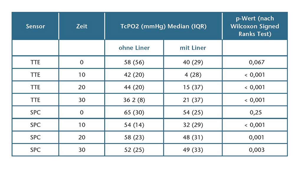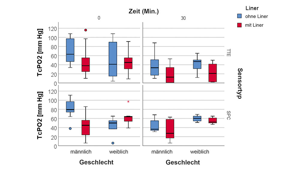 Die statistischen Analysen wurden mit SPSS (Version 23, IBM Corp., Chicago, Illinois, USA) durchgeführt. Eine Trennschärfeanalyse (Alpha-Fehler auf 0,05 eingestellt) ergab eine Mindeststichprobengröße von 13 Teilnehmern. Die entsprechende zugrunde liegende Annahme war ein TcPO2-Wert von 35 mmHg für Bedingung 1 (ohne Liner) und ein TcPO2-Wert von 50 mmHg für Bedingung 2 (mit Liner) mit einer Standardabweichung von 15 mmHg. Da die visuelle Datenprüfung eine Abweichung von der Normalverteilung der TcPO2-Werte sowohl für die Sensoren als auch für die Bedingungen zeigte, wurde ein Shapiro-Wilk-Test auf Normalverteilung angewendet, der diesen ersten Eindruck bestätigte. Somit wurden nichtparametrische statistische Tests durchgeführt. Wilcoxon-Vorzeichen-Rang-Tests wurden verwendet, um die TcPO2-Werte zwischen den beiden Bedingungen zu untersuchen, die zu den verschiedenen Zeitpunkten gemessen wurden. Um einen möglichen Zeiteffekt auf die beiden getesteten Bedingungen zu testen, wurde ein nichtparametrisches Modell mit wiederholten Messungen (Friedman-Test) verwendet, um die absoluten Unterschiede der TcPO2-Werte innerhalb der jeweiligen Bedingung zu untersuchen.