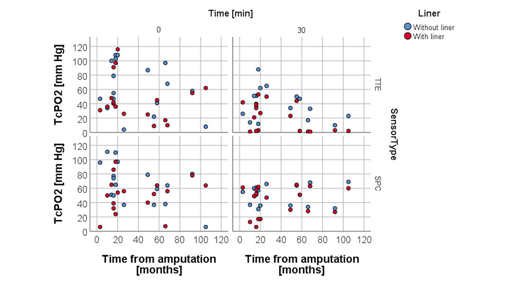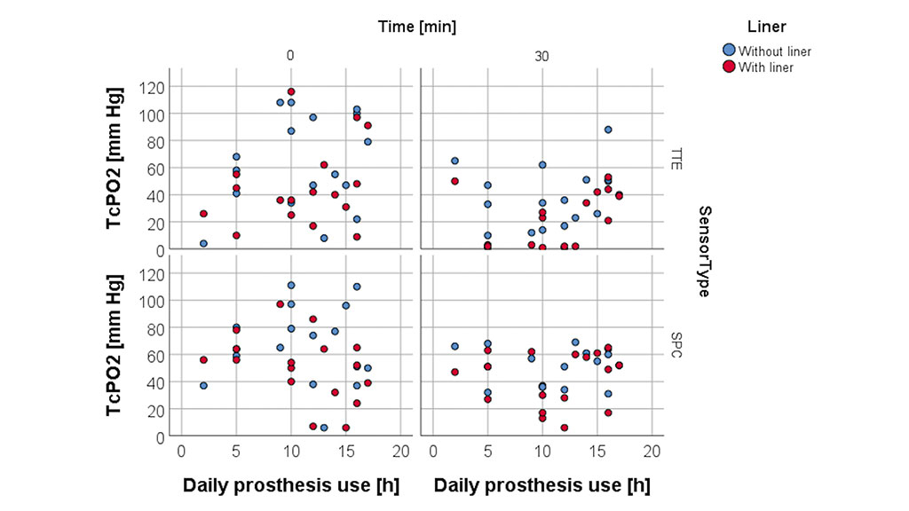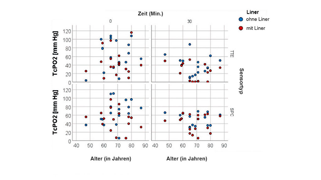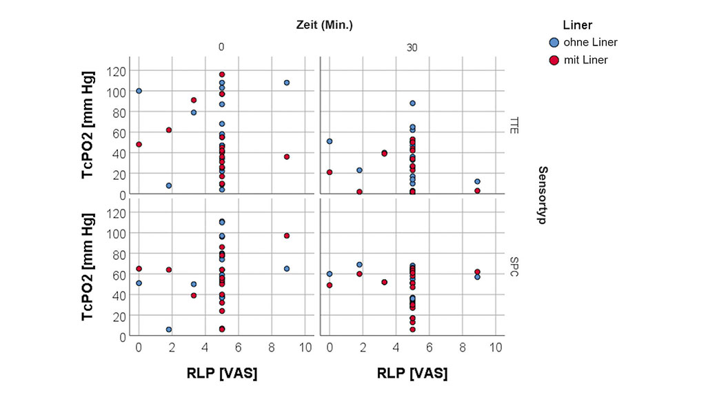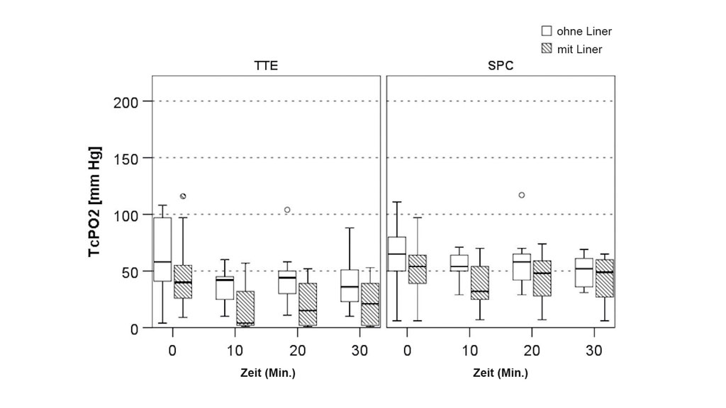 Die Messungen wurden für alle Teilnehmer in der gleichen Reihenfolge durchgeführt, d. h., es wurde das gleiche Protokoll für jeden Studienteilnehmer durchgeführt. Zu Beginn der Testsitzung lag die zu testende Person auf einer Liege auf dem Rücken, beide Beine gestreckt und mit freigelegtem Stumpf (keine Prothese und kein Liner). Nach einer 15-minütigen Akklimatisierungszeit, in der gemäß der Bedienungsanleitung die Kalibrierung, die Erwärmung der Sonden auf 44 °C und der Haut durch die Sensoren erfolgten, wurde die erste Basismessung (T0) ohne den Liner aufgezeichnet. Danach wurden drei weitere Messungen ohne den Liner nach 10, 20 und 30 Minuten durchgeführt, insgesamt also vier Messungen (T0, T10, T20, T30). Das gleiche Verfahren wurde wiederholt, diesmal aber mit angelegtem Liner. Um druckbedingte Messfehler sowie Druckgeschwüre zu vermeiden, wurden kleine Löcher entsprechend der Größe der Sensoren aus dem Liner ausgestanzt, sodass kein externer Druck auf die Sensoren ausgeübt wurde. Das Stanzen der Löcher in den Liner dauerte ungefähr eine Minute, während der Teilnehmer auf der Liege liegen blieb. Keiner der Sensoren wurde entfernt. Die TcPO2-Daten wurden visuell abgerufen.