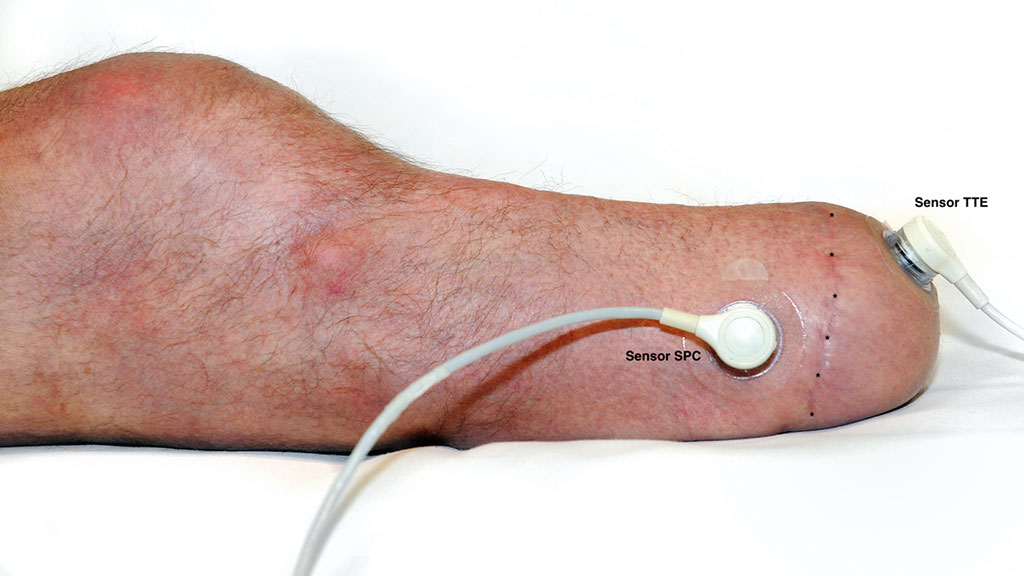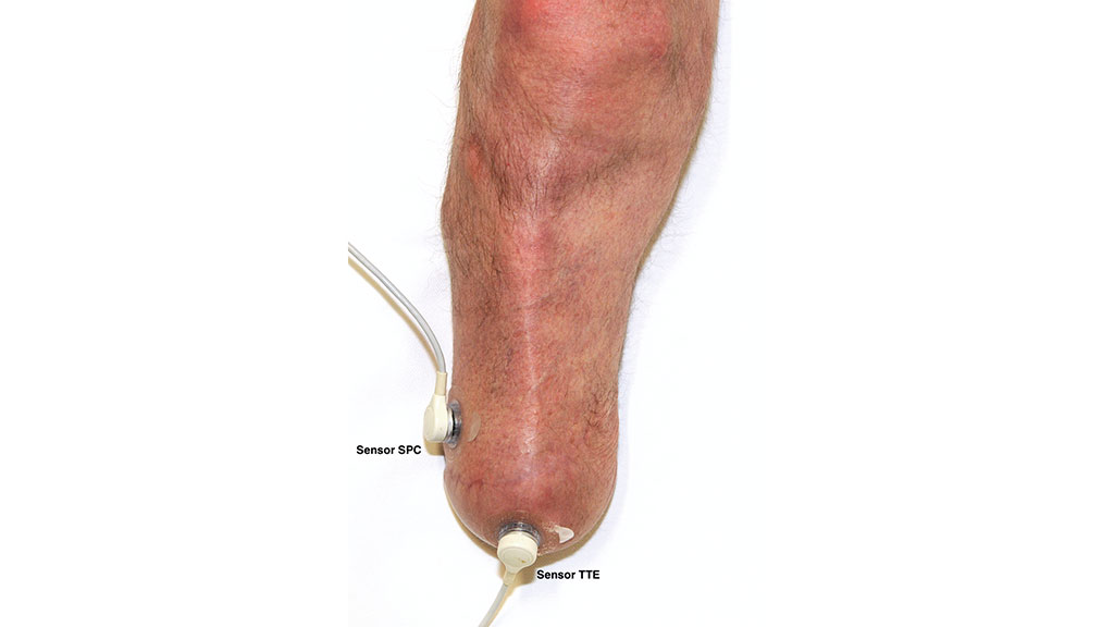 Zum Zweck der TcPO2-Messungen wurden die Studienteilnehmer in Rückenlage gebracht, die als beste Position für die Diskriminierung von Ischämien der Extremitäten beschrieben wird 40 41. Das Knie war während des gesamten Messvorgangs vollständig gestreckt. Alle Messungen wurden in Ruhe durchgeführt, d. h., vor der Testsitzung wurden keine Aktivitäten durchgeführt. Die Sensoren wurden vom TCM4-Messgerät automatisch kalibriert und erwärmt. Es wurden zwei Sensorelektroden verwendet, die direkt auf die Haut des Stumpfes platziert wurden, nachdem die Haut mit Alkohol gereinigt und mit einem Mulltupfer getrocknet worden war. Kontaktflüssigkeit (Radiometer, Bronshoj, Dänemark) wurde gemäß der Gebrauchsanleitung in den Raum zwischen Haut und Sensor eingefüllt. Ein Sensor wurde in der Horizontalebene über der Spitze des Tibiaendes (Sensor TTE) platziert, wo der verbleibende Gastrocnemiuslappen fixiert ist; der zweite Sensor wurde in der Sagittalebene distal über dem peronealen Kompartiment (Sensor SPC) platziert (Abb. 1 u. 2). Diese Stellen wurden gewählt, weil sie die distalsten Teile des hinteren Hautlappens (Sensor TTE) bzw. des vorderen Hautlappens (Sensor SPC) darstellen. An diesen Orten ist die Perfusion am stärksten eingeschränkt, und sie stellen das Worst-Case-Perfusionsszenario dar.