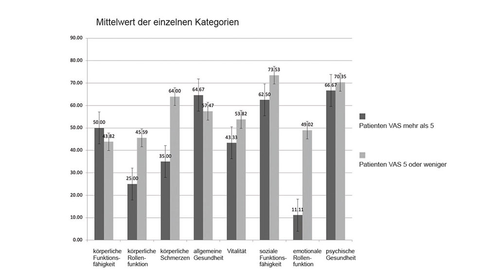 Alle SF-36-Ergebnisse sind in den Abbildungen 3 und 4 dargestellt. Im Vergleich zu altersbezogenen normativen Daten 42 erzielten die Studienteilnehmer in allen Teilwerten niedrigere Werte (Abb. 3). Darüber hinaus erzielten Teilnehmer, bei denen Schmerzen mit VAS ≥ 5 auftraten, höhere Werte bei körperlicher Funktionsfähigkeit und allgemeiner Gesundheit, geringere Werte hingegen in allen anderen SF-36-Teilbereichen (Abb. 4). Der Vergleich der SF-36-Ergebnisse mit den K‑Levels ergab, dass Teilnehmer mit einem K3-Level oder höher ihre körperliche und geistige Gesundheit niedriger bewerteten als Teilnehmer mit einem K2-Level oder weniger.
