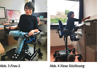 Auch Frau S. kam anlässlich der Rehacare in Kontakt mit dem Unternehmen. Gleich bei der ersten Sitzprobe auf dem Messestand fand sie die richtige Sitzhaltung für ihre Büroarbeit. Ihr Antrag auf einen Indoor-Elektrorollstuhl mit elektrischer Höhenverstellung wurde genehmigt. Insbesondere die Erfahrung, zum ersten Mal allein etwas einscannen zu können, unabhängig von der Hilfe ihrer Kolleginnen und Kollegen, schildert sie als großen Zugewinn ihrer neuen Sitzlösung (Abb. 3 u. 4).