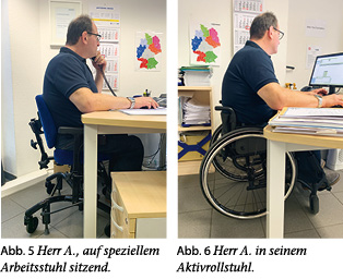 Herr A. ist Kundenberater bei einer Auto-Umbau-Firma, die Umbauten für Menschen mit körperlichen Einschränkungen fertigt. Er ist der Verfasserin seit 2009 bekannt – zu dieser Zeit konnte er noch einige Schritte gehen, heute jedoch nicht mehr. Herr A. hält sich bei der Arbeit abwechselnd im Büro, im Empfangsraum mit Kunden oder in der Werkstatt auf. Dazu nutzt er seinen Aktivrollstuhl, auf dessen Mobilität er nicht verzichten möchte. Testweise wurde ihm dennoch ein Arbeitsstuhl zur Verfügung gestellt, um zu ermitteln, ob hierdurch eine bessere Sitzposition erreichbar wäre (Abb. 5 und 6). Tatsächlich ist beim Sitzen im Aktivrollstuhl zu erkennen, dass sein Becken nach hinten kippt, wenn er am Telefon bzw. am Computer arbeitet. Das Sitzen auf dem Arbeitsstuhl ist für Herrn A. zwar ungewohnt, aber es ist deutlich erkennbar, dass sein Becken in einer anatomisch günstigeren Position gehalten wird.