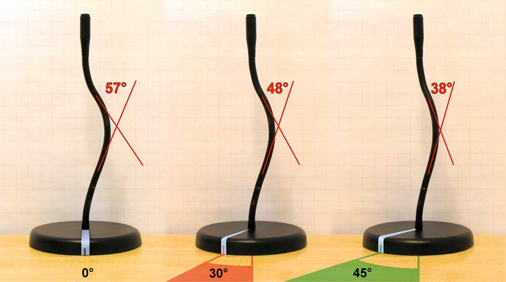 Eine rotierte Kurve stellt sich im Schattenbild aber immer verfälscht dar. Als Beispiel sei hier zunächst die einfache, komplette Rotation einer technischen Kurve im Raum aufgeführt (Abb. 1). Dabei wird sichtbar, dass sich der Krümmungswinkel der 2‑D-Projektion einer Kurve durch Rotation erheblich verändert. Der tatsächliche Winkelwert der Kurve liegt unverändert bei 57°. Dennoch misst man in der 2‑D-Projektion bei 30° Rotation nur noch 48° und bei 45° Rotation nur noch 38°. Somit würde bei einem etwaigen Röntgenbild allein durch Rotation von 45° ein Drittel der Krümmung „unsichtbar“.
