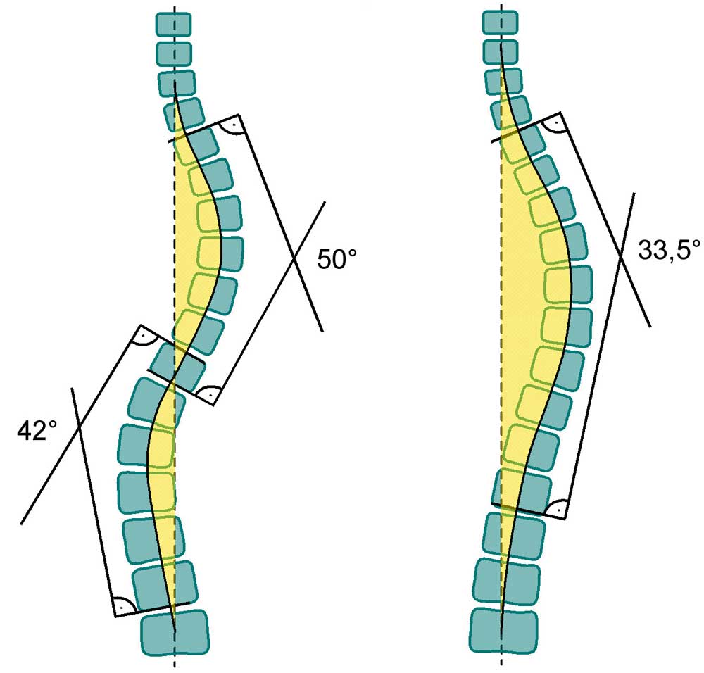 Der Cobb-Winkel erfasst die Krümmungsreichweite nicht. Es wäre ein sehr komplexes Unterfangen, die Korrelation von Krümmungsreichweite und Deformität zu quantifizieren. Eine gute „visuelle“ Abschätzung der Schwere einer Deformität kann man aber leicht durch die Flächen zwischen der C7-S1-Verbindungslinie und der Mittellinie der Wirbelkörper erhalten (siehe Abb. 3).