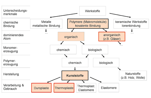 Die Einordnung der Spachtelmasse in die Werkstofflehre erfolgt wie von Saechtling in Abbildung 2 dargestellt über die chemischen Verbindungsverhältnisse der atomaren Strukturen 19.
