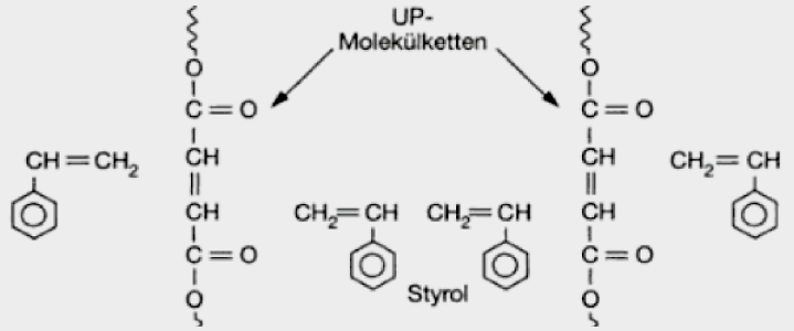 Durch den peroxidischen Starter werden nach dem Mischen der Komponenten schon bei Raumtemperatur die relativ kurzen Polyesterketten quervernetzt 25. Das instabile Dibenzoylperoxid zerfällt bereits unter geringem Energieaufwand in Radikale, die die C=C‑Doppelbindungen von UP und Styrol bzw. MMA lösen 26. Die Kohlenstoffe des Bindemittels mit den freien Elektronen sind nun in der Lage, eine chemische Bindung (kovalente Bindung) mit dem Styrol oder MMA einzugehen. Das heißt, eine Copolymerisation erfolgt. Die mit der Härtung der UP-Harze einhergehende Freigabe von Reaktionswärme hat zur Folge, dass es zur Volumenschwindung des Materials kommt. Die Schwindung, die bei 4 bis 9 % 27 liegt, kann mithilfe von Füllstoffen verringert werden.