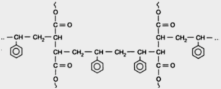 Das Molekül (Abb. 4) besteht aus einem Benzolring und einer Vinylgruppe. Die Strukturformel für Styrol lautet H5C6-CH=CH2, die Summenformel C8H8. Das Mischungsverhältnis zwischen UP und Styrol beträgt ungefähr 2 : 1. Je höher die Styrolanteile, umso geringer die Fließfähigkeit des Spachtels 23. Zudem ist Styrol im Gemisch besonders gut für die radikalische Copolymerisation (Abb. 5) mit den ungesättigten Polyesterketten geeignet.