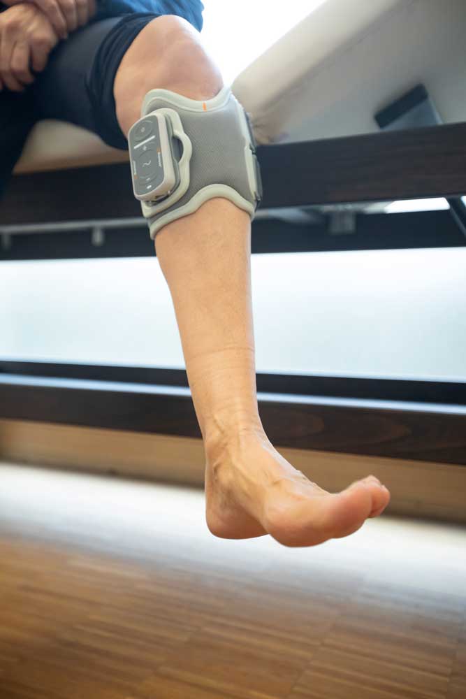 Zeitgemäße FES-Systeme (Abb. 5) verbinden neueste medizinisch-technische Errungenschaften mit therapeutischem Know-how und bieten in der Versorgung von PwMS besondere Perspektiven. Sie werden direkt am Körper getragen, können je nach Bedarf vom Patienten und Therapeuten ein- oder ausgeschaltet oder die Stimulation verstärkt werden und sollen sowohl in der stationären und ambulanten Rehabilitation als auch in der ambulanten Physiotherapie eingesetzt werden. Sie sind aber primär für den alltäglichen Gebrauch gedacht. Durch eine echtzeitgenaue Gangerkennung wird unmittelbar vor der Schwungphase ein Stimulationsimpuls gesendet, der einen sicheren und aktiven Bewegungsablauf gewährleistet und das Gehen nachhaltig verbessern kann. Allerdings muss dieser Impuls gekonnt und individuell an den Gang des Patienten angepasst werden. Hier sind kompetente und erfahrene Orthopädietechniker gefragt, die idealerweise zusammen mit den Therapeuten und dem Patienten die Erprobung und Anpassung durchführen. So konnte bei PwMS eine signifikante Reduktion der wahrgenommenen Anstrengung beim Gehen sowie eine deutliche Verbesserung der Lebensqualität nachgewiesen werden 31 32 33. Insbesondere unter dem Aspekt der Teilhabe zeigt eine gut eingestellte FES einen deutlichen Mehrwert im Vergleich zum bewährten Versorgungsstandard mit Orthesen. Allerdings bedingt sie von Anfang an eine präzise Patientenauswahl 34. FES ist dann ideal für die krankheitsspezifischen, funktionellen Gangprobleme bei PwMS. Folgende Gütekriterien sollte ein sicheres FES-System vorweisen: