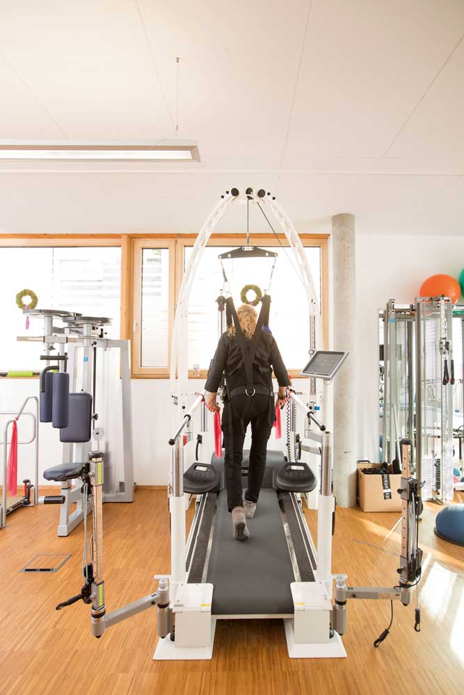 - Unterstützend sollte ein systematisches Ausdauertraining mittels eines Laufbands (Abb. 2), Ergometer, Gehen und gezieltes Krafttraining für Fußheber, Hüftbeuger, Wadenmuskulatur und Quadrizeps (Abb. 3) durchgeführt werden.