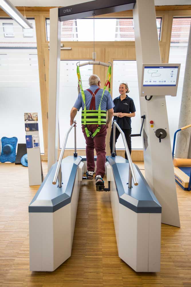 - Für schwer Betroffene (EDSS-Skala bzw. Expanded Disability Status Scale > 6) sollte ein roboterassistiertes Gangtraining eingesetzt werden (Abb. 4).