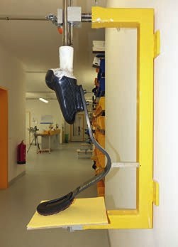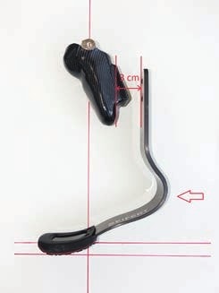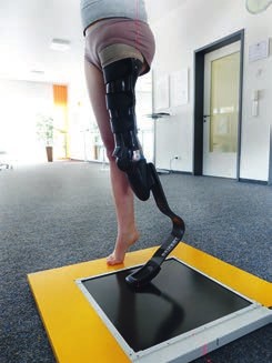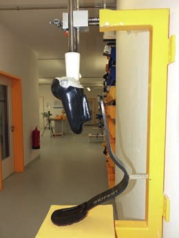 Dem gegenüber steht jedoch die notwendige Überlänge der ungestauchten Carbonfeder von ca. 5 cm (Abb. 4), womit ein zu starkes Einsinken im Anfangskontakt des Laufzyklus verhindert wird. Wäre dies nicht der Fall, müsste das gesunde Bein die Höhendifferenz des Hüftniveaus ausgleichen, was dauerhaft zu einer unphysiologischen Überbelastung führen würde. Die Überlänge der Feder definiert sich aus dem Anwendungsprofil des Sportlers.