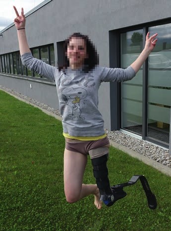 Eine 20-jährige Patientin wurde mit einer Sport-Orthoprothese versorgt. Sie wurde im Alter von acht Jahren nach Borggreve Typ A1 amputiert (Abb. 1). Durch eine bilaterale monozentrische Gelenkführung und seitliche Titanschienen werden das obere Sprunggelenk und der Oberschenkel geführt. Zudem ist dadurch eine Pro- und Supinationsbewegung des unteren Sprunggelenks nahezu ausgeschlossen, um einen zusätzlichen Verschleiß des Knorpel- und Bandapparates im Fuß zu vermindern. Um den Fuß zu unterstützen, ist ein gut ausmodelliertes Fußbett nötig. Hierbei wurde insbesondere auf die Anstützung des Längs- und Quergewölbes sowie auf den Zehensteg, um den sich die Zehen klammern, geachtet. Ein HTV-Silikon-Innentrichter (Abb. 2), der druckentlastende und formbeständige Eigenschaften aufweist, gewährleistet überdies den Schutz des Fußes. Hygienische Vorteile können durch regelmäßiges Auskochen des Silikons erzielt werden und damit unter anderem Hautirritationen verringern.