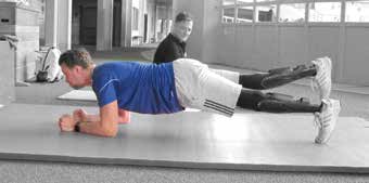Die­se Übung för­dert vor allem eine sta­bi­le Rumpf­mus­ku­la­tur. Dabei wird der Kör­per auf die Unter­ar­me und die Zehen­spit­zen gestützt. Die Arme lie­gen schul­ter­breit, die Füße ste­hen etwa hüft­breit aus­ein­an­der. Der Trai­nie­ren­de hält die­se Posi­ti­on. Der Schwie­rig­keits­grad kann deut­lich erhöht wer­den, indem man abwech­selnd ein Bein anhebt. Bei die­ser Übung ist es beson­ders wich­tig, dass der Kör­per nicht durch­hängt und kei­nen Tun­nel bil­det, son­dern in einer Linie gehal­ten wird. Sobald das Bein geho­ben wird, darf sich die Hüf­te nicht ver­dre­hen (Abb. 4a u. b).