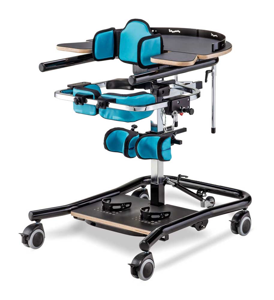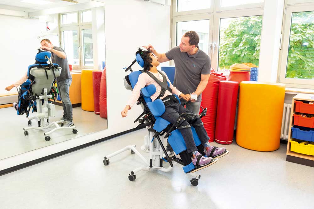 Aber es gibt noch weitere Vorteile: Dass sich die Wahrnehmung des eigenen Körpers sowie die Raumwahrnehmung in der Vertikalen verändern, ist leicht nachzuvollziehen. Zudem ist die Kopfkontrolle im Stehen oft besser als im Sitzen. Dies kann zur Förderung von Aktivitäten wie Kauen und Schlucken genutzt werden, ebenso zur Sprachförderung und zum Kommunikationstraining. Das Stehtraining ist also ein wichtiger Baustein aller Therapiemaßnahmen.