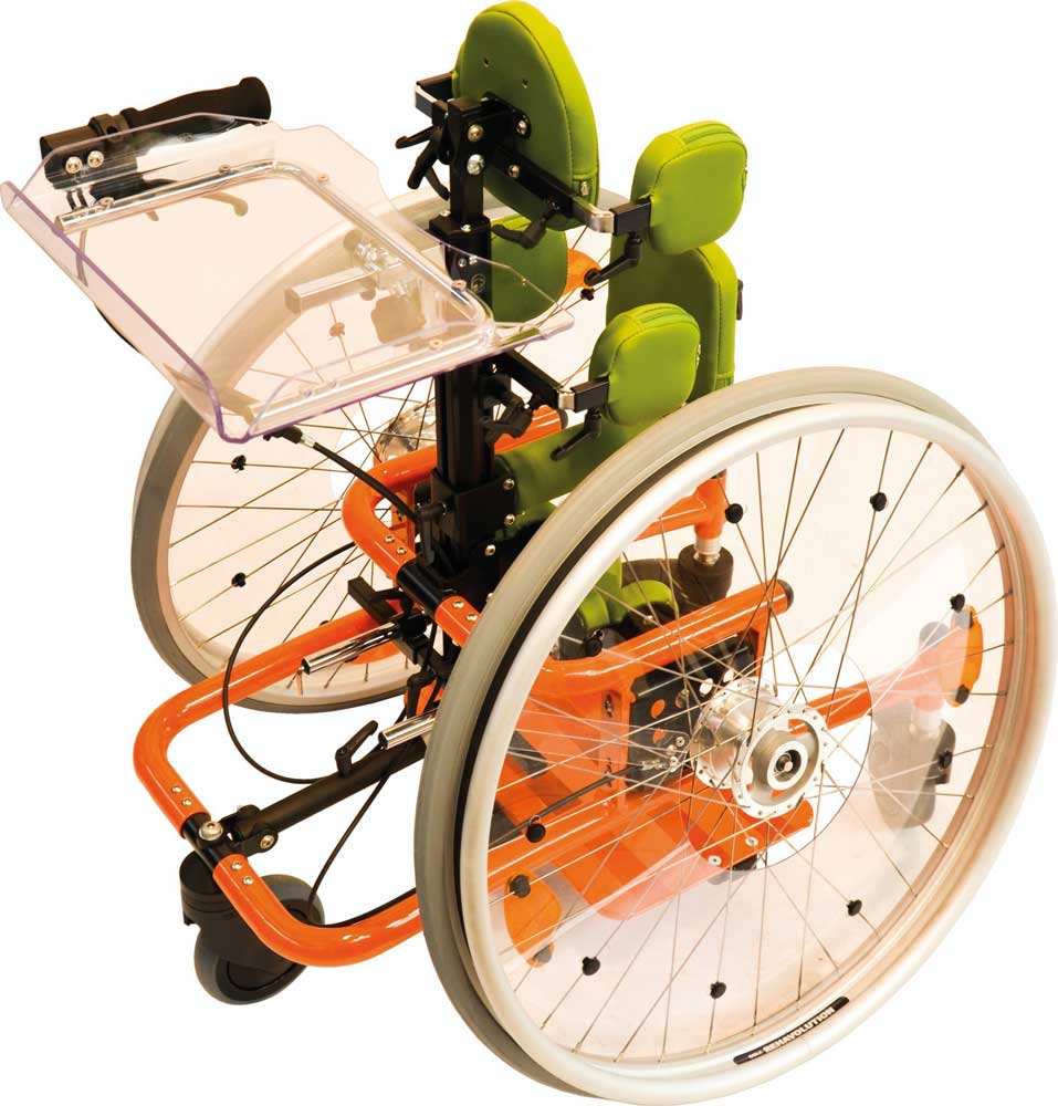 - Mobile Stehtrainer: Unter mobilen Stehtrainern (Abb. 4) werden Modelle mit Greifreifen verstanden, die den Nutzern eine selbstständige Fortbewegung ermöglichen. Dabei gelten die gleichen Ansprüche an die Positionierung wie bei einem klassischen Stehtrainer. Durch die großen Antriebsräder ist zusätzlich eine eigenständige Fortbewegung möglich. Wichtige Aspekte wie Unabhängigkeit, Freiheit und Selbstständigkeit werden durch einen mobilen Stehtrainer in weitaus höherem Maße verwirklicht als durch ein klassisches Modell. Durch die Aktivität der Arme, der Schultern und der Hände sowie durch das Steuern und die Anforderungen an die Koordination werden einerseits höhere Anforderungen an den Nutzer gestellt, andererseits aber auch zusätzliche Trainingsmöglichkeiten geboten. Voraussetzungen für eine eigenständige Nutzung sind Schulterkontrolle, Greiffunktion und ausreichende Kraft, hinzu kommen Koordination, Raumwahrnehmung und Visus.