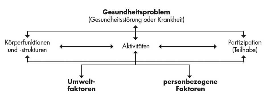 Die von der WHO erarbeitete International Classification of Functioning, Disability and Health (ICF) zur Klassifikation von Gesundheitsstörungen bietet mit dem ihr zugrunde liegenden biopsychosozialen Modell die Möglichkeit, alle für die Gesundheit relevanten Aspekte darzustellen und miteinander in Beziehung zu setzen. Das Hilfsmittelverzeichnis verwendet zur Beschreibung des Bedarfs an manchen Stellen explizit das ICF-Modell, an anderen wird das Vokabular der ICF verwendet. Deshalb wird die ICF auch hier zur Darstellung wesentlicher Aspekte verwandt 2 3 (Abb. 1).