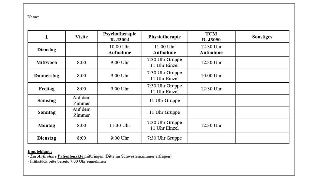 Am Klinikum der Autoren werden die oben genannten Maßnahmen im Rahmen der multimodalen Schmerztherapie in klarer zeitlicher Abfolge durchgeführt. Dabei sind die einzelnen Bausteine der multimodalen Schmerztherapie als gleichwertige und sich gegenseitig ergänzende Therapien zu betrachten. In Abbildung 3 ist exemplarisch ein Wochenplan aus der Klinik dargestellt, der den Patienten vor Beginn des stationären Aufenthaltes ausgehändigt wird. Die beschriebenen supportiven Maßnahmen sind fakultativ durchzuführen; alle anderen genannten Maßnahmen sind während der Therapie obligat.