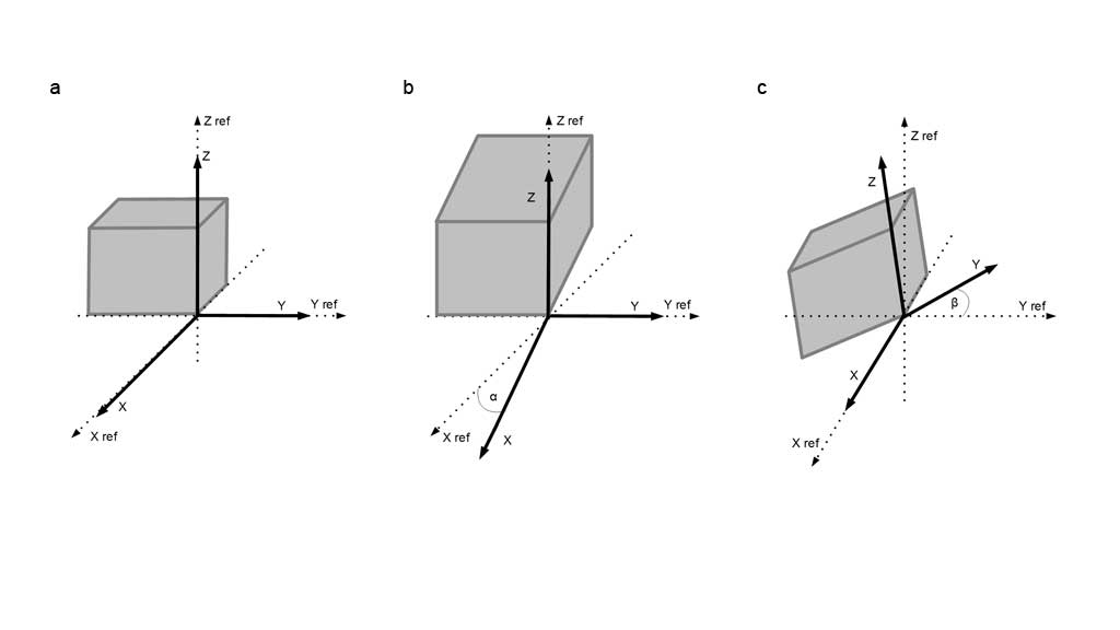 Der entwickelte Algorithmus nutzt statische Beschleunigungen, um die Position des Stumpfes zu bestimmen, und dynamische Beschleunigungen, um zwischen verschiedenen Zuständen der Prothese umzuschalten (z. B. Gebrauchsmodus, gesperrt-entsperrt, Gehmodus). Die Orientierung des festen Körpers wird mit Euler-Winkeln beschrieben, und mithilfe trigonometrischer Formeln können die Neigungswinkel des Akzelerometers bezüglich eines Kartesischen Referenzsystems berechnet werden (Abb. 3a – c):