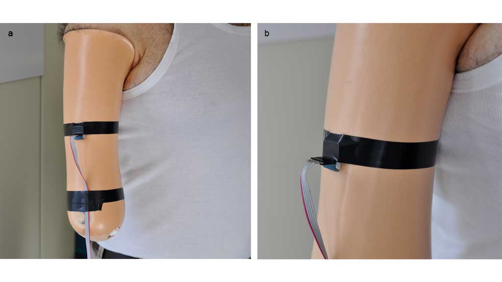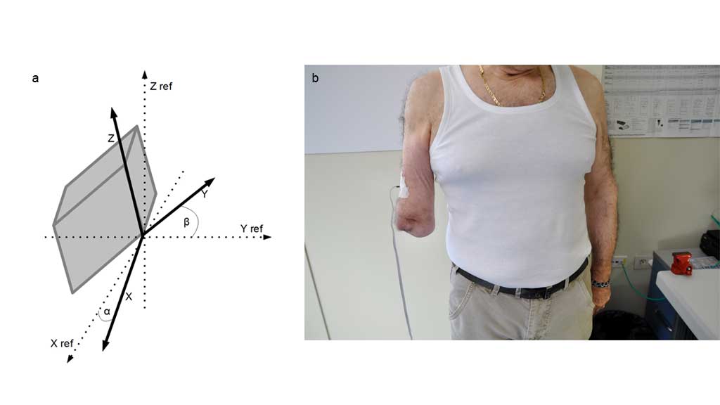 Es ist sehr wichtig, die optimale Position für das Akzelerometer zu bestimmen. Die Autoren haben das Akzelerometer in den Schaft oberhalb der Tuberositas deltoidea platziert, was eine gute Lösung darstellt (Abb. 4a u. b). Im Allgemeinen können die Länge und die Beweglichkeit des Stumpfes von einem Patienten zum anderen variieren, und es muss für jeden einzelnen die optimale Position gefunden werden, um ein Höchstmaß an Bewegungsmöglichkeiten für den Stumpf zu erreichen. Die Flexion/Extension des Ellenbogens und die Drehung des Handgelenks sind abhängig von der Beweglichkeit des Stumpfes (Abb. 5a u. b).