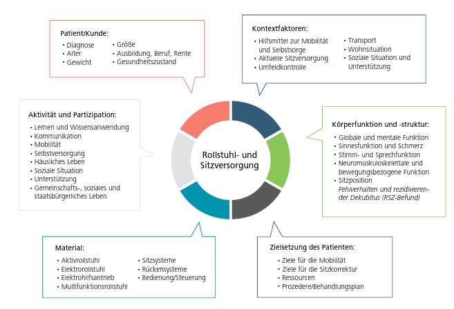 Alle Patientendaten wie Diagnose, Alter, Gewicht, Größe, Ausbildung, Beruf, Rente und Gesundheitszustand werden im Rahmen einer Standortbestimmung erfasst. Sie geben Auskunft über die personbezogenen Faktoren. Beispiele: Bei Patienten im Wachstum ist es wichtig, dass der Rollstuhl in der Sitzbreite sowie der Sitztiefe mitwachsen kann. Bei großen Patienten stehen die Überfahrhöhen von Hindernissen mit der Fußauflage und die Unterschenkellänge in Konkurrenz mit der Unterfahrbarkeit von Tischen im Fokus. Gemeinsam mit dem Patienten werden bei solchen Zusammenhängen Kompromisse gesucht und umgesetzt.
