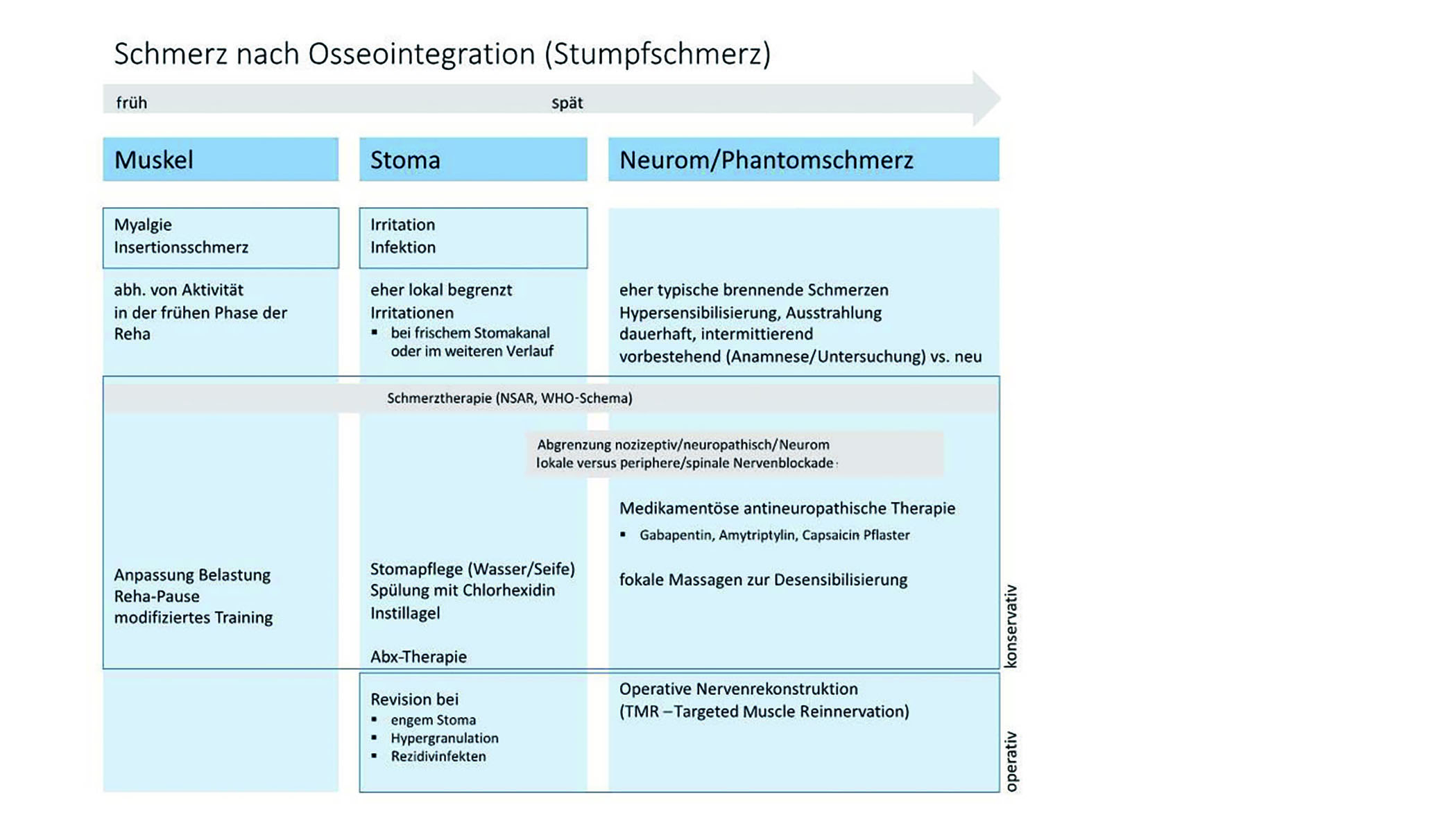 Die Dif­fe­ren­zie­rung der ver­schie­de­nen Schmerz­phä­no­me­ne kann anhand einer Zeit­ach­se in „akut“ und „chro­nisch“ erfol­gen: Wäh­rend die genann­ten Mus­kel­schmer­zen vor allem in der frü­hen Pha­se der Reha­bi­li­ta­ti­on anzu­tref­fen sind, gelingt die Dif­fe­ren­zie­rung der chro­ni­schen Beschwer­den – lokal nozi­zep­tiv, neu­ro­pa­thisch und neurom­be­dingt – nicht immer zufrie­den­stel­lend. Neu­ro­me in der Nähe des Sto­mas kön­nen durch affe­ren­te Fasern aus dem Sto­ma­be­reich getrig­gert wer­den und damit zu einem fort­ge­lei­te­ten Schmerz füh­ren. Die­ses Phä­no­men führt wahr­schein­lich nicht sel­ten dazu, dass die Ursa­che der Beschwer­den direkt am Sto­ma gesucht und in ers­ter Linie eine mecha­ni­sche Irri­ta­ti­on in Erwä­gung gezo­gen wird. Die klas­si­sche „Odys­see“ von Pati­en­tin­nen und Pati­en­ten mit Neu­rom- bzw. mit neu­ro­pa­thi­schen Beschwer­den star­tet daher oft mit einer oder meh­re­ren Sto­mare­vi­sio­nen, viel­leicht auch Stumpf­kor­rek­tu­ren, kon­ser­va­ti­ve und medi­ka­men­tö­se The­ra­pie ein­ge­schlos­sen. Die übli­che Neu­rom­the­ra­pie beinhal­tet in der Regel die Resek­ti­on des Neu­roms durch Rück­kür­zung des Ner­ven mit intra­mus­ku­lä­rer Ver­la­ge­rung. Dies darf als Stan­dard­ver­fah­ren ver­stan­den wer­den, das mit einer recht hohen Erfolgs­quo­te von ca. 80 Pro­zent ein­her­geht. Kau­sa­le ner­ven­re­kon­struk­ti­ve Ver­fah­ren 4 5 wie TMR (Tar­ge­ted Mus­cle Rein­ner­va­ti­on) oder RPNI (Rege­ne­ra­ti­ve Peri­phe­ral Ner­ve Inter­face) dür­fen auf der Grund­la­ge aktu­el­ler Stu­di­en­ergeb­nis­se als mög­li­che Alter­na­ti­ven betrach­tet wer­den, ins­be­son­de­re wenn die allei­ni­ge Resek­ti­on mit intra­mus­ku­lä­rer Ver­la­ge­rung nicht zum Erfolg geführt hat.