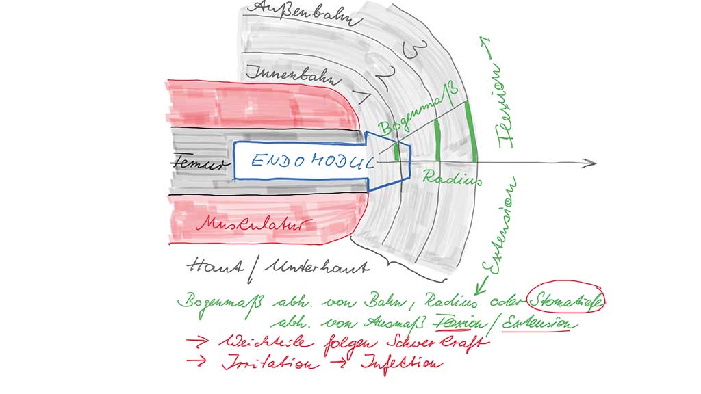 Inso­fern ermög­licht die Ana­mne­se ins­be­son­de­re vor dem Hin­ter­grund schon vor­be­stehen­der beschwer­de­haf­ter Neu­ro­me und eine weich­tei­li­ge Bilan­zie­rung des Ampu­ta­ti­ons­stump­fes eine gute prä­ope­ra­ti­ve Pla­nung vor dem ers­ten Schritt der Endo-Exo-Implan­ta­ti­on. So kön­nen unter Umstän­den auch schon an die­ser Stel­le ner­ven­chir­ur­gi­sche Ein­grif­fe mit in Erwä­gung gezo­gen wer­den. Dies kann den post­ope­ra­ti­ven Ver­lauf ent­schei­dend beein­flus­sen und unnö­ti­ge Pau­sen oder gar dau­er­haf­te Ein­schrän­kun­gen der Lebens­qua­li­tät (etwa bezüg­lich Tra­ge­kom­fort und Tra­ge­dau­er der Exo­pro­the­se) verhindern.