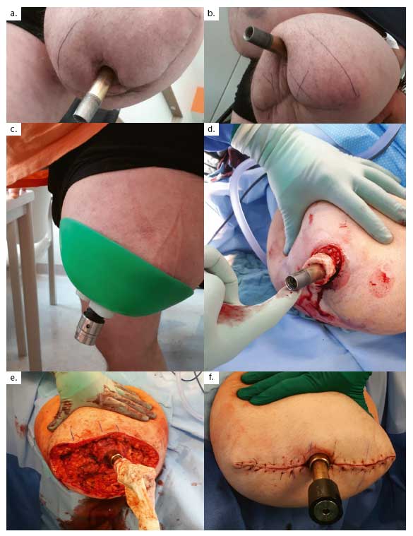 Die chir­ur­gi­sche Kon­ver­si­on von einem „feuch­ten“ zu einem „tro­cke­nen“ Sto­ma mit Modi­fi­ka­tio­nen der Myo­de­se (neben der Myo­plas­tik eine der bei­den übli­chen Ope­ra­ti­ons­tech­ni­ken zur Deckung des Stump­fes bei einer Ampu­ta­ti­on) hat sich nach­hal­tig auf das anfangs hohe Infek­ti­ons­ri­si­ko aus­ge­wirkt 3. Die­ses Ver­fah­ren hat anders als bei der klas­si­schen Ampu­ta­ti­on einen mus­kel­frei­en Durch­tritts­be­reich zum Ziel und ist dar­über hin­aus mit einer wei­te­ren Aus­dün­nung des sub­ku­ta­nen Fett­ge­we­bes ver­bun­den. Ein Weich­teil­plus in der Nähe des Sto­mas bei trans­fe­mo­ra­ler Ampu­ta­ti­on wird sich immer auch auf das angren­zen­de Sto­ma aus­wir­ken – der Ein­fluss die­ses Weich­teil­über­schus­ses ist lage- und belas­tungs­ab­hän­gig (jeweils im Lie­gen, Sit­zen und Stehen/Laufen) dif­fe­rent zu bewer­ten und schließt an die­ser Stel­le Über­le­gun­gen zu einer Ver­bes­se­rung der Sto­ma­po­si­tio­nie­rung (iso­me­tri­sche Plat­zie­rung) ein (Abb. 2) (Abb. 3a‑f).