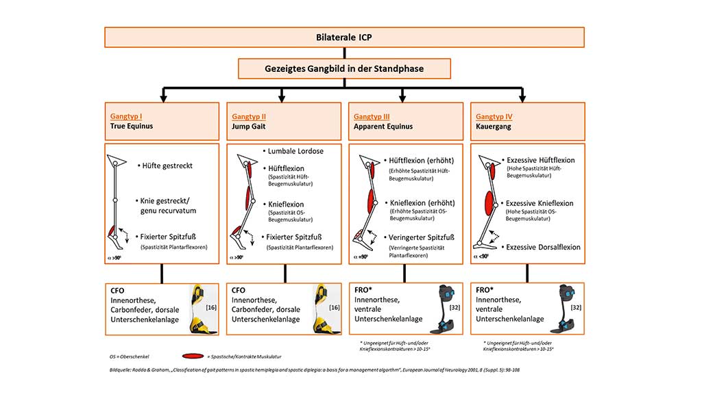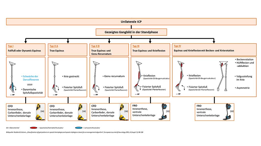 Zur Versorgung der Gangtypen III und IV bei unilateraler ICP scheinen steifere Orthesen wie SAFO oder FRO geeigneter zu sein, da sie vor allem das Sprunggelenk stabilisieren und die Vorwärtsbewegung der Tibia über den Fuß in der Standphase kontrollieren. Ist die Wadenmuskulatur in der Lage, die Plantarflexion in der Standphase ausreichend zu kontrollieren, kann in einzelnen Fällen auch eine dynamischere AFO eingesetzt werden. Nach den Erkenntnissen der verwendeten AFO-Versorgungen für die Gangtypen I und II sollten hier die Vorteile einer CFO ausgenutzt werden 70.