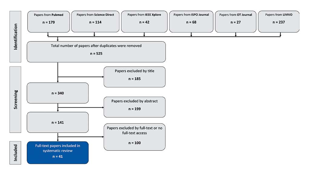 Als Literaturquellen wurden die Datenbanken PubMed, Science Direct, IEEE Xplore und LIVIVO verwendet. Zusätzlich wurden die orthopädietechnikspezifischen Journals „POI“ der International Society for Prosthetics and Orthotics und „ORTHOPÄDIE TECHNIK“ des Verlag OT im BIV-OT durchsucht.