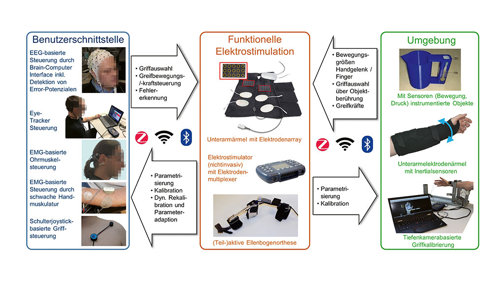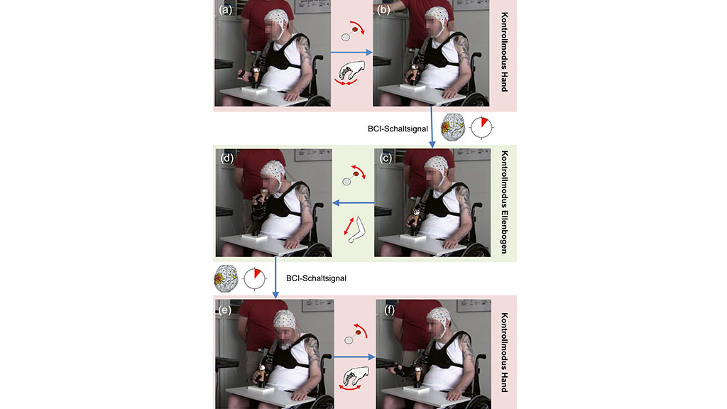 Durch die Ver­wen­dung eines hBCIs bestehend aus einem auf Bewe­gungs­vor­stel­lun­gen basie­ren­den nicht­in­va­si­ven BCI und einem Schul­ter­po­si­ti­ons­sen­sor konn­te zum ers­ten Mal gezeigt wer­den, dass die Kon­trol­le einer nicht­in­va­si­ven Greif- und Ellen­bo­gen­neu­ro­pro­the­se prin­zi­pi­ell mög­lich ist (Abb. 3) 21. Bis zu einer All­tags­an­wen­dung ist es aber auf­grund der hohen Zahl falsch erkann­ter Schalt­be­feh­le des BCIs und der auf­wen­di­gen Hand­ha­bung der Arm-FES-Orthe­se noch ein wei­ter Weg. Damit nicht­in­va­si­ve Neu­ro­pro­the­sen im All­tag funk­tio­nie­ren kön­nen, muss neben den Elek­tro­den­po­si­tio­nen, dem Elek­tro­den­hand­schuh und den Orthe­sen­kom­po­nen­ten auch die Benut­zer­schnitt­stel­le an die indi­vi­du­el­len Wün­sche und Gege­ben­hei­ten des Nut­zers ange­passt werden.