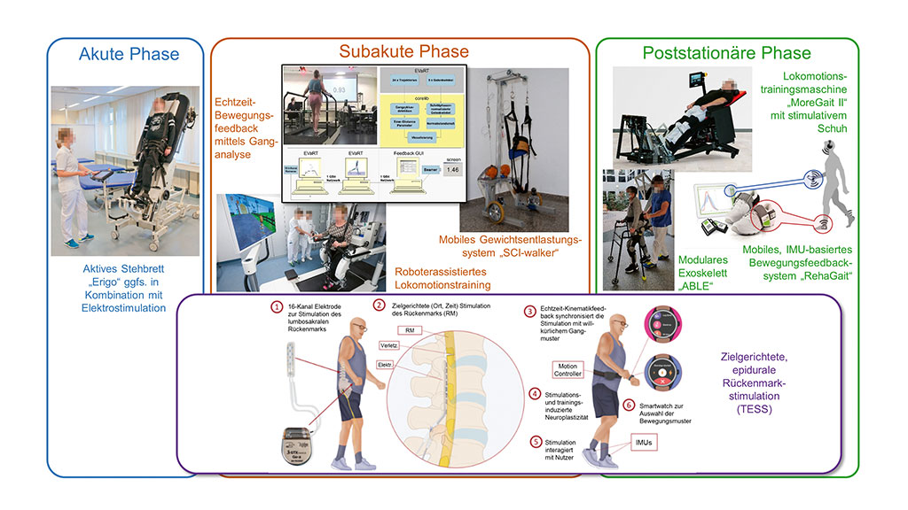 Da bei Pati­en­ten mit weni­gen Rest­funk­tio­nen bis zu drei The­ra­peu­ten zur manu­el­len Unter­stüt­zung der Geh­be­we­gun­gen not­wen­dig sind, haben in vie­len Reha­bi­li­ta­ti­ons­ein­rich­tun­gen robo­ti­sche Loko­mo­ti­ons­trai­nings­ma­schi­nen zur Ent­las­tung der The­ra­peu­ten Ein­zug gehal­ten. Um bereits im frü­hen Sta­di­um der Quer­schnitt­läh­mung mit einem auf neu­ro­bio­lo­gi­schen Erkennt­nis­sen zur Akti­vie­rung des spi­na­len Gang­pro­gramms basie­ren­den Loko­mo­ti­ons­trai­ning begin­nen zu kön­nen, kom­men Gerä­te zur Gene­rie­rung phy­sio­lo­gi­scher, sen­si­bler Sti­mu­li mit der Mög­lich­keit zur kreis­lauf­an­ge­pass­ten Ver­ti­ka­li­sie­rung zum Ein­satz. Bei Pati­en­ten mit rela­tiv guter Moto­rik, aber aus­ge­präg­ten (tiefen-)sensiblen Aus­fäl­len kann ein instru­men­tier­tes Bewe­gungs­feed­back­trai­ning, bei dem den Pati­en­ten ihre Abwei­chung von einem phy­sio­lo­gi­schen Gang­bild in Echt­zeit rück­ge­mel­det wird, zur anhal­ten­den Nor­ma­li­sie­rung des Gang­mus­ters bei­tra­gen 5 6.