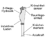 Das Kenevo-Beinprothesensystem ist ein mikroprozessorgesteuertes, einachsiges Kniegelenksystem. Es verwendet eine Hydraulik mit dem bereits vom C‑Leg bekannten 2‑Wege-Prinzip, bei der die Widerstände in Flexions- und Extensionsrichtung unabhängig voneinander durch den Mikroprozessor 100-mal pro Sekunde stufenlos gestellt werden können 5. Die Sensoren umfassen eine Axialkraftmessung, eine Knöchelmomentmessung, einen Kniewinkel- und Kniewinkelgeschwindigkeitssensor sowie eine neuartige 6‑achsige Raumlageeinheit (Inertial Motion Unit, IMU), welche die Lage und Rotationsgeschwindigkeit des Kniegelenksystems im Raum bestimmt (Abb. 2).