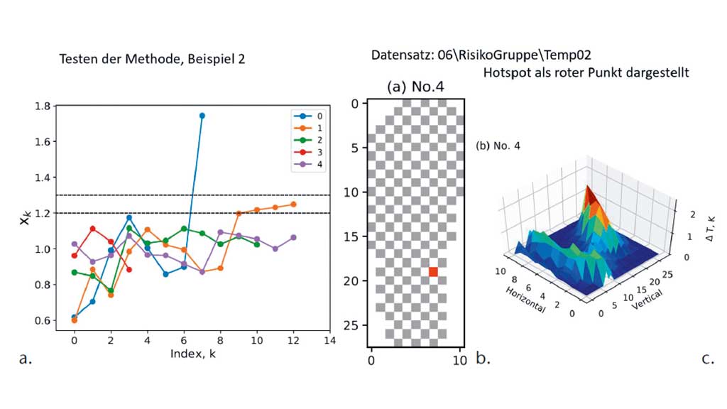 Insgesamt wurden über 90 Datensätze bei den 21 Probandinnen und Probanden erhoben. Weitere Datensätze zur Simulation einer Entzündung wurden mit verschiedenen anderen Ansätzen generiert, beispielsweise mit eingelegten Wärmeplättchen. Entsprechende Vergleichsversuche zur Simulation von „Hotspots“ wurden zu unterschiedlichen Zeiten durchgeführt und dienten der generellen Überprüfung der Theorie bzw. der Messgenauigkeit der Sensoren (Abb. 9).