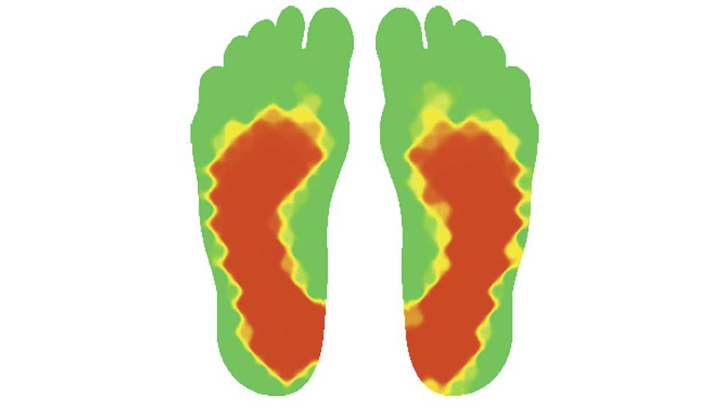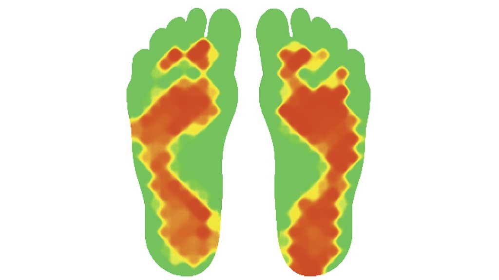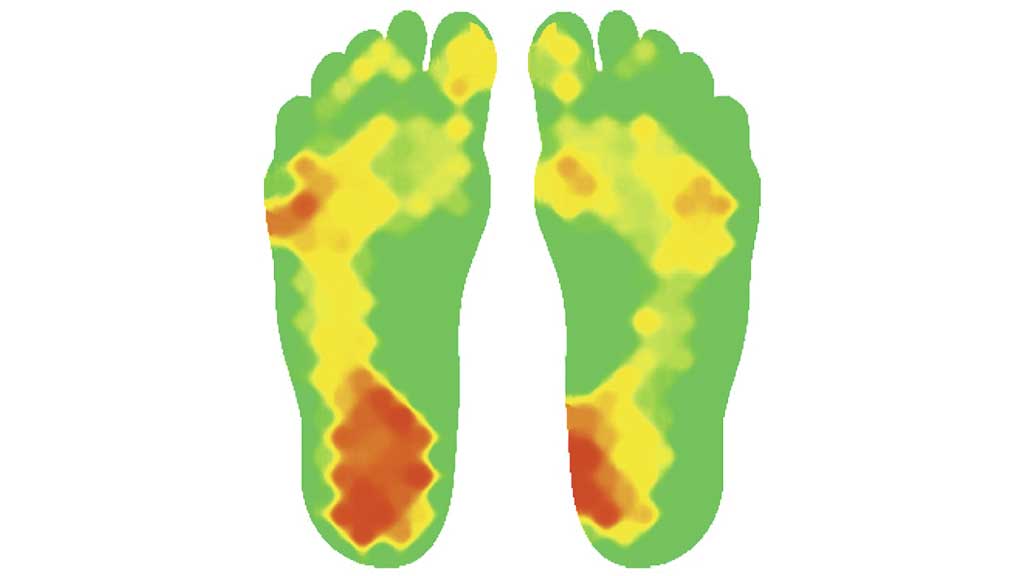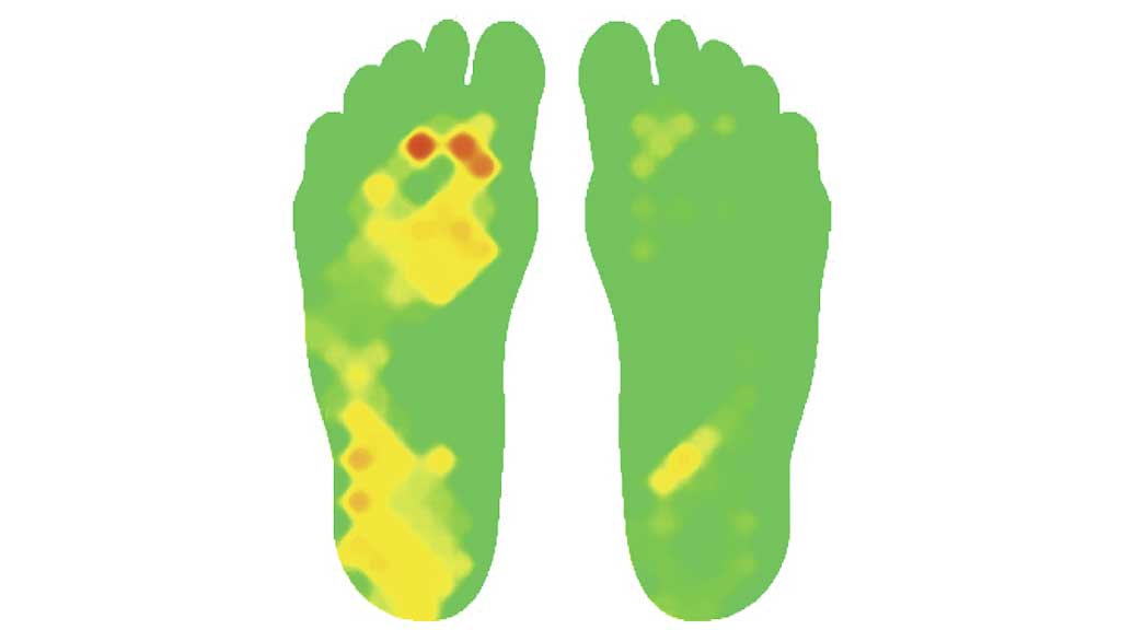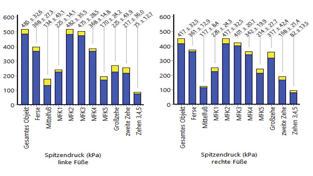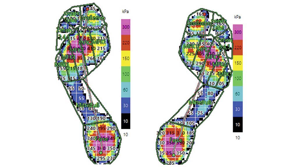 Aufnahmen mit der Hyperspektralkamera verdeutlichen zwar die komplexen Unterschiede in der Durchblutung der Füße, zeigen aber keine Unterschiede in der Temperatur. Diese Messungen sind allerdings sehr gut geeignet, um Entzündungen zu detektieren (siehe den Hotspot bei „Oxygenierung Tiefe“; Abb. 4). Die Kombination beider Verfahren führte zu einer aussagekräftigen Datenlage. Vergleichend wurden immer wieder Pedografie-Messungen herangezogen, um ein besseres Ursachenverständnis zu erreichen (Abb. 5a u. b).