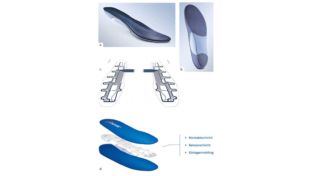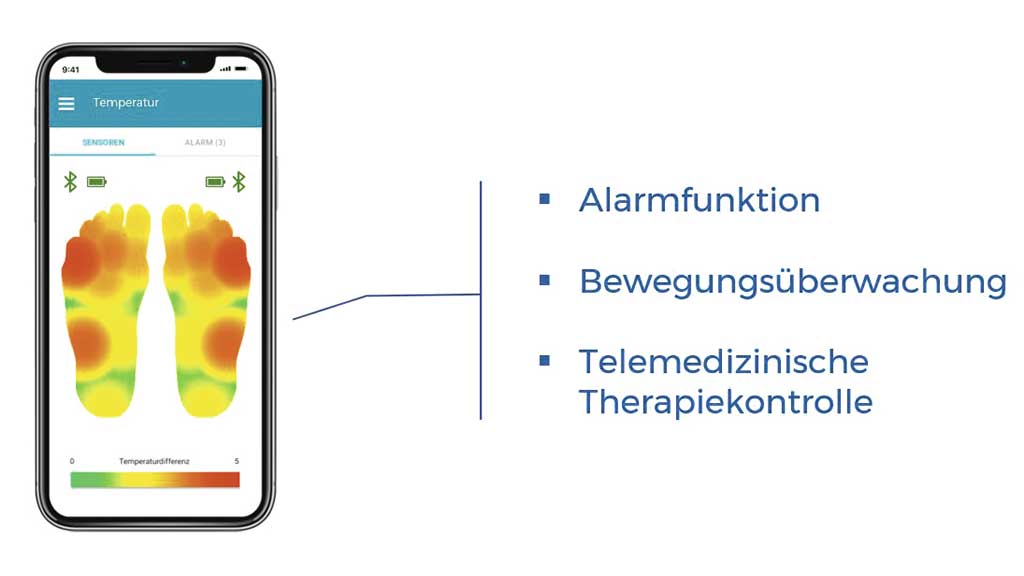 Die Einlage kann sowohl konfektioniert als auch maßgenau gefertigt werden. Einlagenmaterial, Deckschicht und weitere Komponenten können dabei frei gewählt werden. Die Technologie ist auch in einer diabetesadaptierten Fußbettung (DAF) einsetzbar. Kern ist immer ein 0,5 Millimeter dünnes Sensornetz, das die Fußsohlentemperatur mittels Thermistoren (Temperatursensoren) auf 0,1 Kelvin genau misst. Dieses ist in einer planen flexiblen Folie enthalten, die keinerlei Bedingungen an die Einlagengeometrie stellt oder Druckstellen erzeugt, dargestellt in Abbildung 11c. In der App werden die Messwerte des Nutzers ausgewertet. Der Algorithmus vergleicht diverse Parameter und ermittelt Temperaturdifferenzen, die auf beginnende Entzündungen schließen lassen. Nutzerinnen und Nutzern wird somit die Möglichkeit eröffnet, bereits bis zu mehrere Wochen vor der Bildung eines Ulkus oder einer Wunde einen Arzt bzw. eine Ärztin aufzusuchen. Diese können dann entsprechende präventive Maßnahmen ergreifen bzw. eine Therapie einleiten. Abbildung 11d stellt den Aufbau der Einlage schematisch dar. Ein komplementäres Produkt zur „Smart Sensory Insole“ ist die bereits erwähnte Smartphone-Applikation für den Anwender, schematisch dargestellt in Abbildung 12.