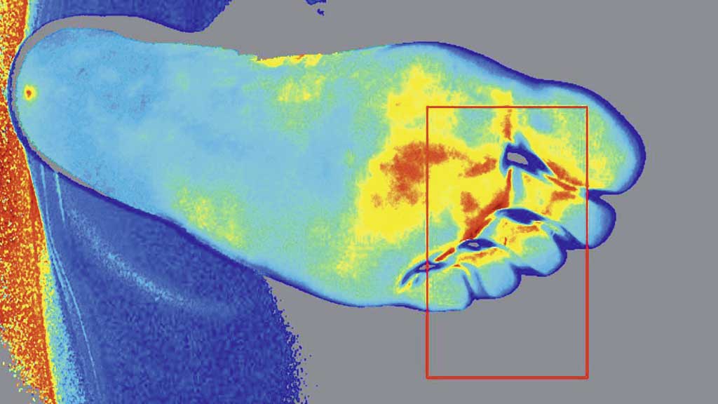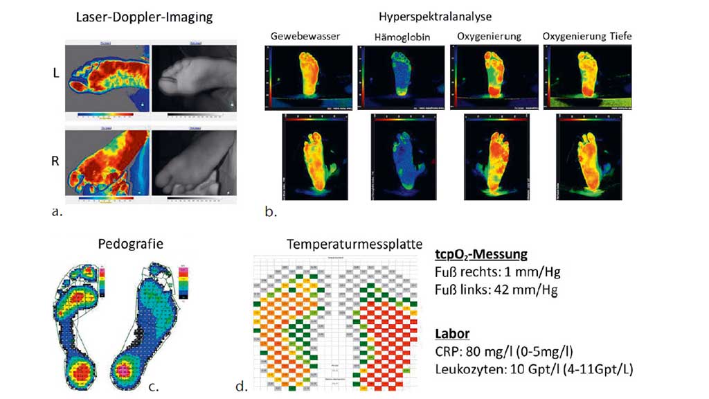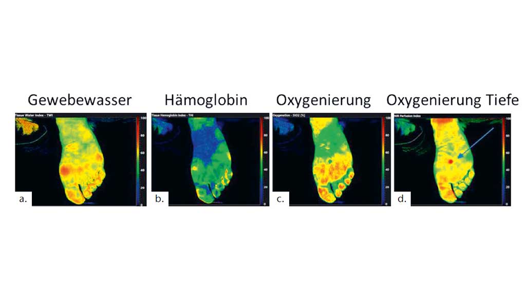 Während Laser-Doppler- und tcpO2-Messungen sich als sehr zeitaufwendig herausstellten, erwiesen sich Aufnahmen mittels Wärmebildkamera und Hyperspektralkamera zur Vermessung von Patienten als deutlich geeigneter (Abb. 3). Ein besonderer Vorteil dieser Verfahren bestand darin, dass die Auswertung hierbei sowohl ein Maß für die gesamte Fußfläche als auch für einen einzelnen Punkt zuließ – wodurch auch einzelne Hotspots detektiert werden konnten.