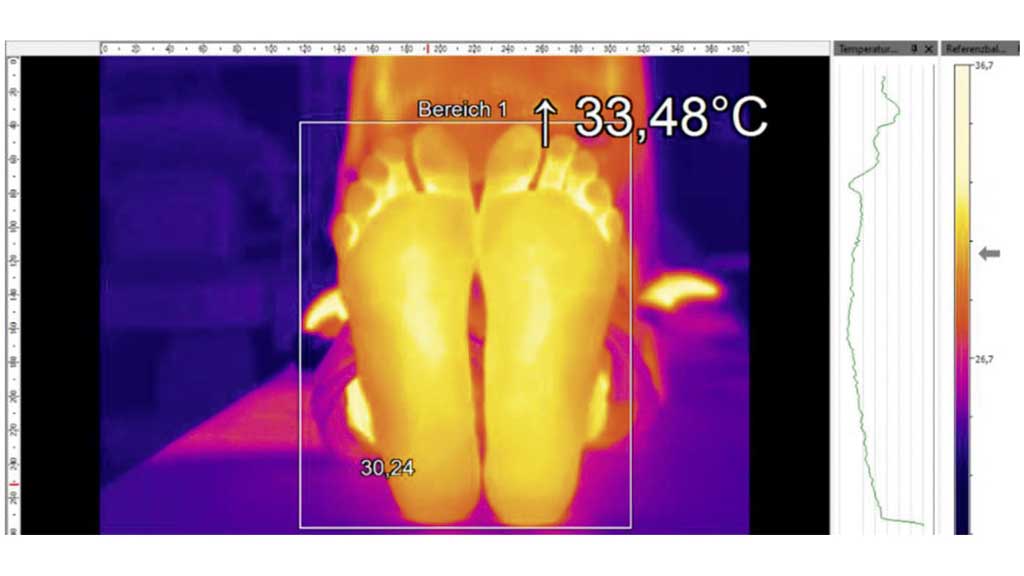 Für einen entsprechenden Abgleich der Wärmeentwicklung bzw. zur möglichen Detektion von entstehenden Entzündungen wurden verschiedene Techniken wie tcpO2-Messungen oder Laser-Doppler-Imaging zur Messung der Mikrozirkulation des Blutes durchgeführt und ausgewertet (Abb. 2). Speziell die Laser-Doppler-Aufnahmen bedurften großer Sorgfalt und bedeuteten einen hohen Zeitaufwand. Dies wurde von den Probandinnen und Probanden oft als unangenehm empfunden, und jede Bewegung führte unweigerlich zu nicht auswertbaren Bildern. Die mit diesem Verfahren gesammelten Daten waren daher häufig zu ungenau.