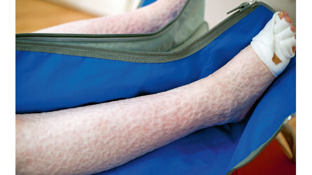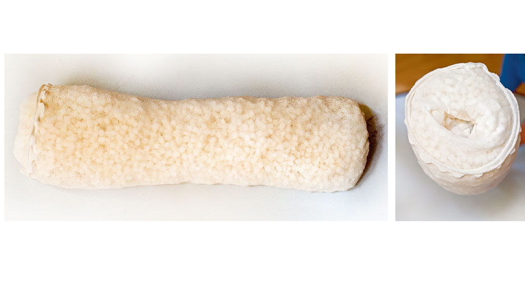 Bei der erstmals 2018 veröffentlichten apparativen IPK+-Methode verwendet man handelsübliches IPK-Equipment, d. h. mit einer Vielzahl von Kammern aus Kunststoff ausgestatteten Manschetten, die steuerbar von Geräten mit Druckluft befüllt werden. Die Manschetten liegen, über Reißverschlüsse verschlossen, rund um die zu behandelnden Körperregionen. Die Drücke, die auf den Hautmantel wirken, nehmen von Zelle zu Zelle ab, um so die im Gewebe krankhaft angesammelte Ödemflüssigkeit abzudrainieren. Diese schon lange bekannte Behandlungsmethode wird im Weiteren als Intermittierende Pneumatische Kompressionstherapie in traditioneller Arbeitsweise (IPK itA) bezeichnet. Bei der IPK+-Methode werden zu dem soeben beschriebenen Prozedere unter den Manschetten reichlich mit 0,5 bis 1 cm großen Schaumstoffwürfeln gefüllte Polsterungen in Form von Kissen oder Rundumversorgungen der Extremitäten mittels Muffen mitverwendet, deren Wandstärke mindestens 7 cm beträgt13 (Abb. 1). Gut gepflegt halten solche Polsterungen, die auch einer Kochwäsche standhalten, selbst bei täglicher Anwendung bis zu ca. 3 Jahre. Durch jahrelanges Experimentieren mit verschiedenen Materialien festigte sich bei dem Anwender die Erkenntnis, dass mit Stoffen, die elektrostatische Eigenschaften aufweisen, signifikant bessere Resultate erzielt werden als mit antistatischen. Die Gründe für diese unterschiedlichen Reaktionsweisen sind bislang nicht geklärt14. Bei der Durchführung einer IPK+-Anwendung wird die untenliegende Würfelschicht unter Druck in den epifaszialen Gewebezylinder mobilisiert, während nachfolgende Würfel der darüber befindlichen Ebenen dehnend in viele verschiedene Richtungen wirken. Nach erfolgten Anwendungen sehen wir ein typisches Hautbild, das vorübergehend eine Unzahl an kleinen Vertiefungen aufweist. Hieraus kann u. a. auf eine Vergrößerung der Behandlungsfläche um mindestens das Doppelte geschlossen werden (Abb. 2). Sofern vor solchen auch gewebemobilisierenden Anwendungen palpatorisch ein indurierter Zustand bestand, kann zum Ende der Therapie eine deutliche Lockerung festgestellt werden.