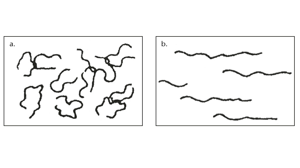 Rheologie – dieser aus dem Griechischen stammende Begriff bedeutet „die Lehre des Fließens“15. Als Teil der Wissenschaft beschäftigt sie sich mit der Gestaltveränderung und dem Fließverhalten von Stoffen. Dieses bereits sehr alte Fachgebiet wurde als eigenständige Disziplin um 1930 von E. C. Bingham und M. Reiner in Easten (USA) begründet16. Umfangreiche Recherchen des Autors ergaben, dass vor ihm wohl noch nie eine Verbindung zwischen Lymphologie und Rheologie hergestellt wurde. Dies erscheint insofern interessant, als proteinreiche Ödeme eine den Abtransport hemmende Viskosität (Zähigkeit) aufweisen; je geringer diese ist, desto dünnflüssiger und daher fließfähiger wird ein Fluid. Da der bereits beschriebene „Entzündungscocktail“ reichlich biologische Polymere enthält, ist es naheliegend, dass eine solche Flüssigkeit sich in Bezug auf das Fließverhalten anders als ein Newton‘sches Fluid wie z. B. Wasser verhält17. In der Rheologie bezeichnet man eine solche als ein nicht Newton‘sches Fluid mit einem strukturviskosen Fließverhalten. Dies bedeutet: Wird die Flüssigkeit Scherkräften ausgesetzt, verringert sich deren Viskosität, synonymhaft spricht man dann von Strukturviskosität oder „pseudoplastic“ 18. Scherkräfte, die z. B. durch Rühren oder ein Durchwalken herbeigeführt werden, führen zu Veränderungen in solchen dann aufgebrochenen Strukturen. Polymere bestehen aus langkettigen Molekülen, die unter Ruhebedingungen eine knäuelartige Struktur einnehmen. In einer Strömung werden die Polymerketten orientiert, und die Anzahl der Verschlaufungen kann reduziert werden. Über einen solchen Vorgang erklärt sich letztlich die Reduktion der Viskosität19 (Abb. 3). Ausgehend von der Erkenntnis, dass die Viskosität eines Fluides hauptsächlich von der inneren Reibung zwischen den Molekülen abhängt, spielen auch thermische Einflüsse eine gewichtige Rolle. Wärme verringert die Zähigkeit und führt darüber hinaus zu einer erhöhten Kinetik der Moleküle20. Zum Ende dieser Betrachtung muss noch festgestellt werden, dass sich unser Fluid unter Ruhebedingungen allmählich wieder in den ursprünglichen Zustand zurückbewegt, diesen Vorgang bezeichnet man in der Rheologie als Thixotropie21. Noch erwähnt sei, dass es nicht Newton‘sche Fluide gibt, die gänzlich andere Reaktionsmuster aufzeigen, so z.B. dilatante Fluide, die sich unter dem Einfluss von Scherung verfestigen. Im Kontext dieser Abhandlung spielen diese aber keine Rolle22 (Abb. 4).