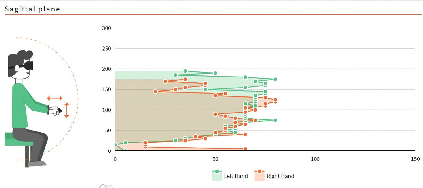 Die laufende Auswertung und Aufzeichnung der Bewegungsdaten ermöglicht eine individuelle Anpassung und eine stufenlose Graduierung der einzelnen Übungen. Als Nebeneffekt können diese Daten zum Beispiel auch Verbesserungen hinsichtlich des Greifraums aufzeigen (Abb. 7).